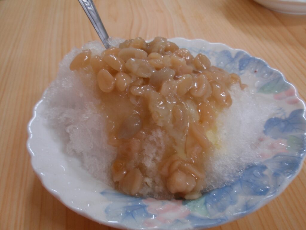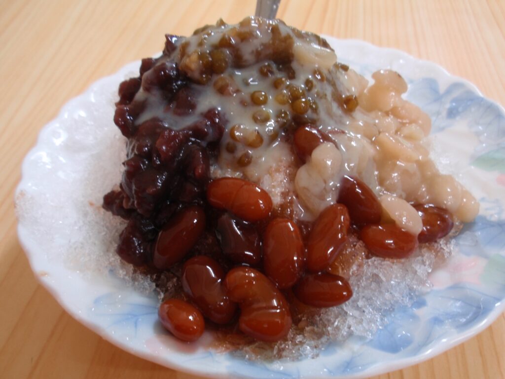 賣冰的阿媽叫陳色,個子矮矮的,滿頭白髮,駝點小背,打起果汁手腳溜咧(俐落),店裡最有名的就是三豆冰,紅豆、花豆跟綠豆,阿媽每天都在門口用炭火熬煮
